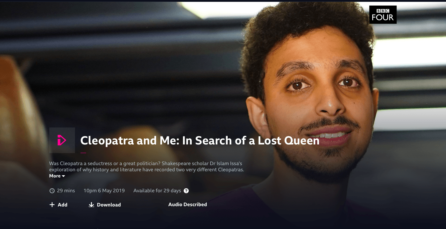 • Cleopatra and Me: In Search of a Lost Queen, BBC Four (premiere 6th May 2019; repeat December 2019, June 2020)